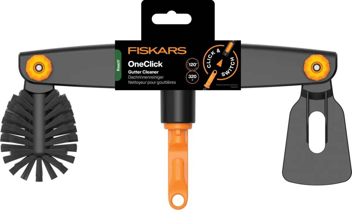 Ο καθαριστής υδρορροών Fiskars OneClick έχει σχεδιαστεί για την αποτελεσματική συντήρηση των υδρορροών απευθείας από το έδαφος. Συνδυάζει μια ξύστρα για την απομάκρυνση χονδρών και επικαθισμένων ακαθαρσιών και μια στρογγυλεμένη βούρτσα για τον τελικό καθαρισμό. Χάρη στη ρυθμιζόμενη γωνία της κεφαλής εργασίας και στο τηλεσκοπικό στέλεχος, το OneClick σας επιτρέπει να καθαρίζετε τις υδρορροές γρήγορα και χωρίς τον κίνδυνο που συνεπάγεται η εργασία πάνω σε σκάλα.