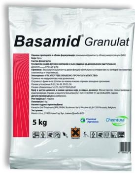 ή ασβέστη. Κατά την απολύμανση, το προϊόν απλώνεται ομοιόμορφα στην επιφάνεια του εδάφους (με διανομέα, με το χέρι) και δουλεύεται αμέσως στο επιθυμητό βάθος, και στη συνέχεια η επιφάνεια ισοπεδώνεται ή κυλιέται ελαφρά. Για να εξασφαλιστεί επαρκής υγρασία του εδάφους για 3-5 ημέρες μετά την εφαρμογή, το ξηρό έδαφος ψεκάζεται μέχρι να επιτευχθεί η απαραίτητη υγρασία. Για να διατηρηθεί αυτή και να αυξηθεί η αποτελεσματικότητα του Basamid, συνιστάται η κάλυψη της επεξεργασμένης περιοχής για 5-7 ημέρες με μουσαμά, πλαστική μεμβράνη κ.λπ.