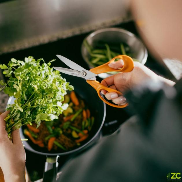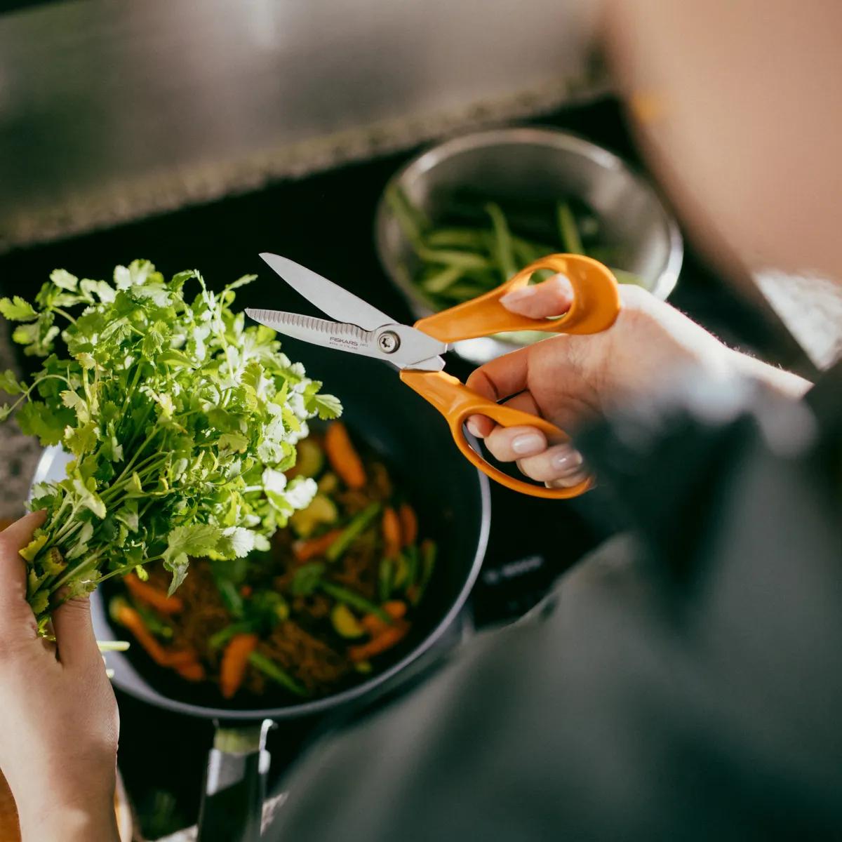 Kuchynské nožnice Fiskars sú vhodné na strihanie mäsa aj zeleniny. Môžu sa použiť aj na otváranie balíčkov v kuchyni.