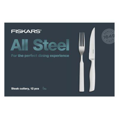 Τα μαχαιροπήρουνα για μπριζόλες Fiskars All Steel κατασκευάζονται από υψηλής ποιότητας ανοξείδωτο ατσάλι στο εργοστάσιο Sorsakoski στη Φινλανδία. Το σετ 12 τεμαχίων με πιρούνια και μαχαίρια σε μοντέρνο σχεδιασμό είναι σχεδιασμένο για 6 άτομα.