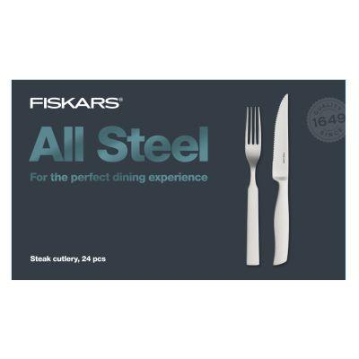 Τα μαχαιροπήρουνα για μπριζόλες Fiskars All Steel κατασκευάζονται από υψηλής ποιότητας ανοξείδωτο ατσάλι στο εργοστάσιο Sorsakoski στη Φινλανδία. Το σετ με πιρούνια και μαχαίρια 24 τεμαχίων σε μοντέρνο σχεδιασμό είναι σχεδιασμένο για 12 άτομα.
